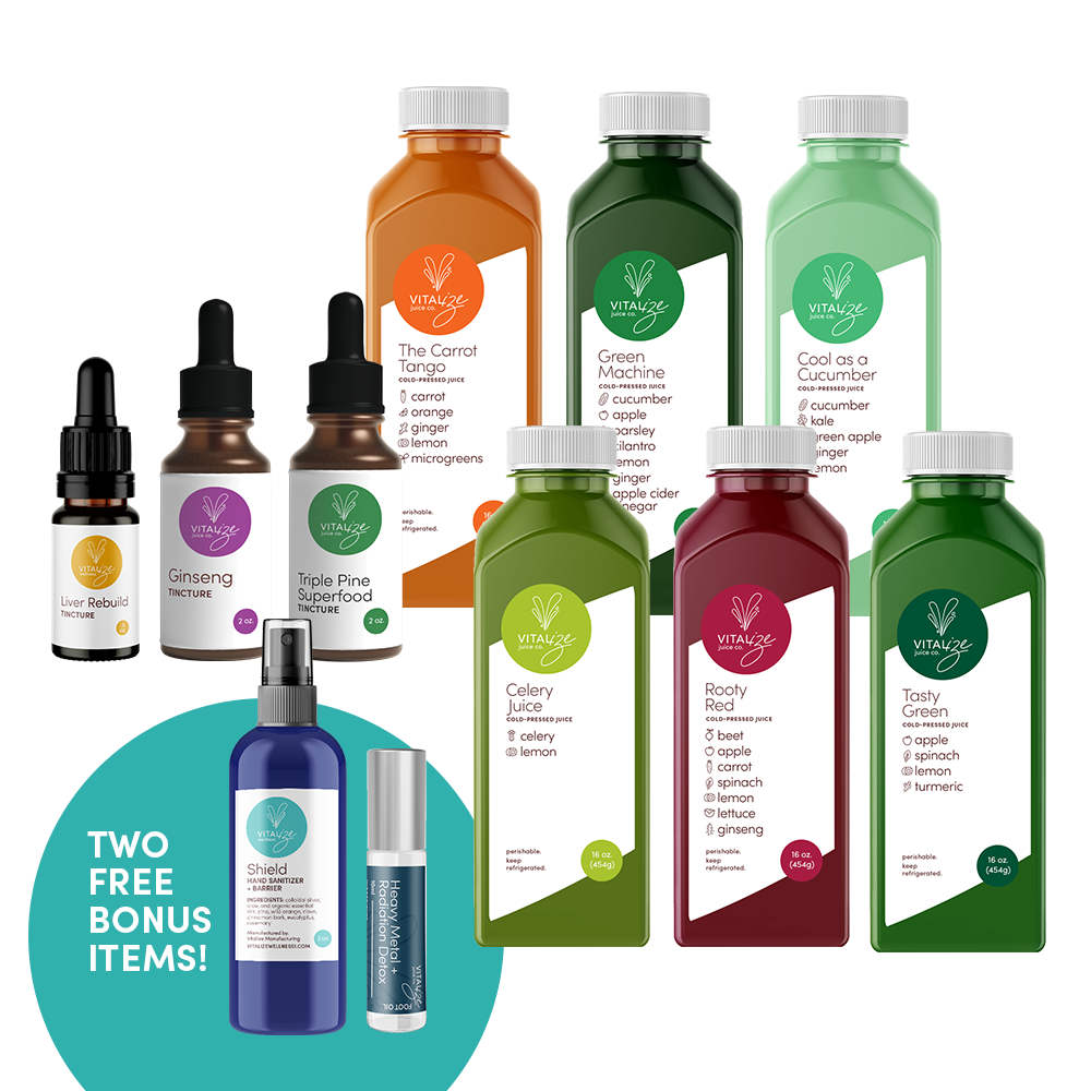 If you looking for a 21 day jump start to kick your system into gear with delish juice and healing herbs this is for you. Purchase the entire 21 Day Reset Bundle and you will recieve our Shield Hand Sanitizer + Barrier and Heavy Metal + Radiation Detox Foot Oil Roller for FREE.