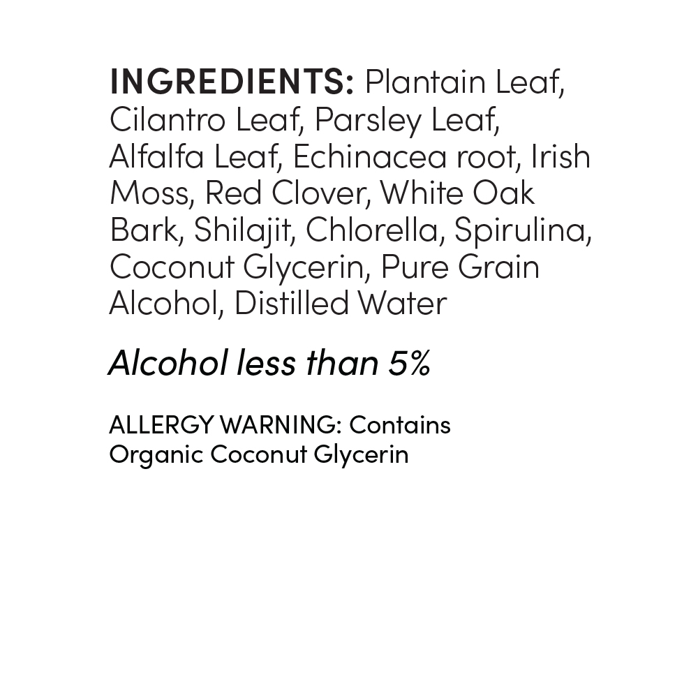 Plantain Leaf, Cilantro Leaf, Parsley Leaf, Alfalfa Leaf, Echinacea root, Irish Moss, Red Clover, White Oak Bark, Shilajit, Chlorella, Spirulina, Coconut Glycerin, Pure Grain Alcohol, Distilled Water