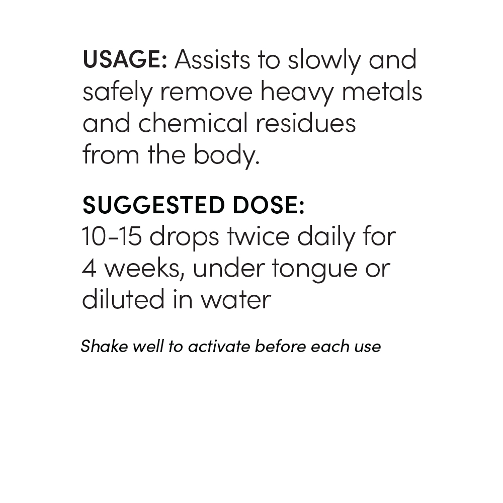 Heavy Metals are everywhere- in our air, water, food, and even personal care products. This gentle tincture helps your body release what it doesn’t need. Our heavy metal detox is gentle and very effective. We have incorporated binders into the tincture. Take 25 drops a day for 4-5 weeks slowly bind and purge excess heavy metals and toxins .Best taken under tongue or in 1 ounce of liquid. If your feeling extra cautious add our toxin binder to your order.